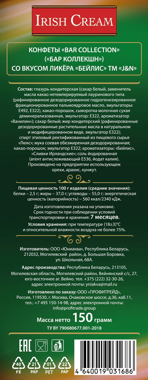 Глазурь кондитерская (сахар белый, заменитель масла какао нетемперируемый лауринового типа (рафинированное дезодорированное гидрогенизированное фракционированное пальмоядровое масло, эмульгаторы: Е492, Е322), какао-порошок, эмульгатор: Е322, ароматизатор Ванилин); сахар белый; жир растительный (кокосовое масло, жир кондитерский (рафинированные дезодорированные растительные масла в натуральном и модифицированном виде, антиокислитель концентрат смеси токоферолов)); спирт этиловый ректификованный из пищевого сырья Люкс; мука соевая обезжиренная дезодорированная; какао-порошок; эмульгатор Е322; ароматизаторы: Бейлис, Сливки Ирландские; соль поваренная пищевая йодированная (агент антислеживающий Е536, йодат калия).
