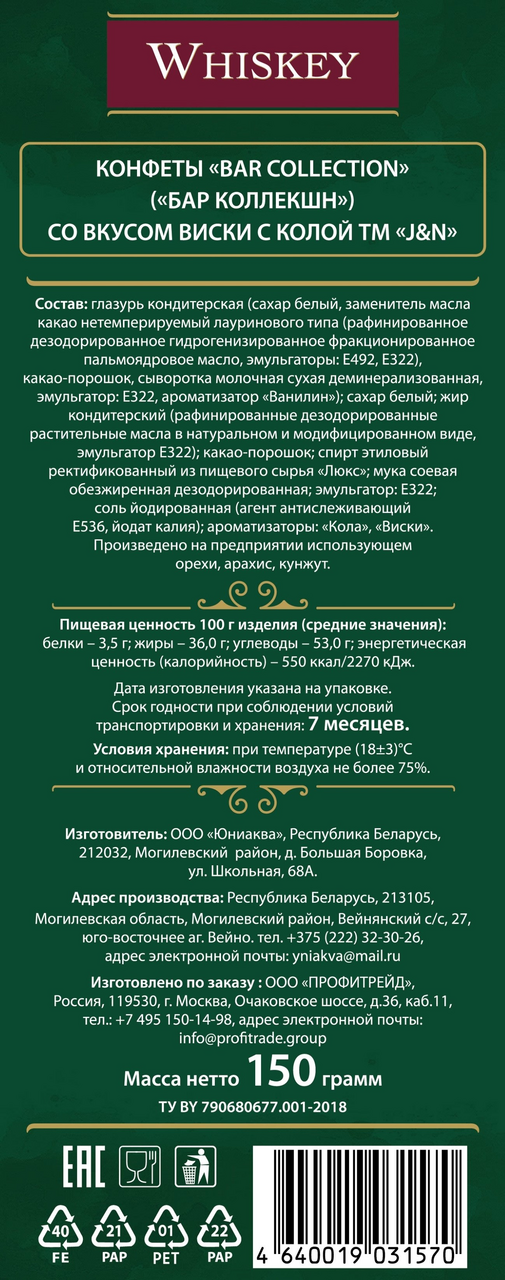 Whiskey and Coke(виски-кола) - барная классика и звезда многих голливудских фильмов. Коктейль с более чем 100 летней историей. Один из топовых коктейлей во всех барах мира. J&N Bar Collection представляет смелое прочетние классики завёрнутой в изысканную глазурь.Шоколадные конфеты с виски подарят отличное настроение и заряд бодрости всем без исключения.