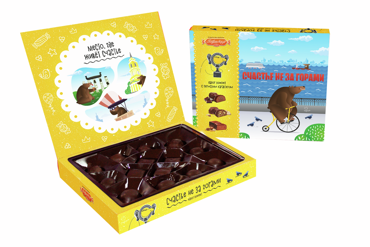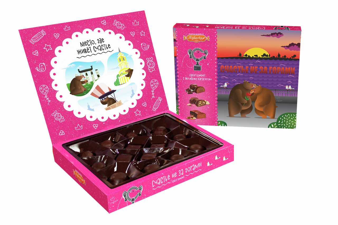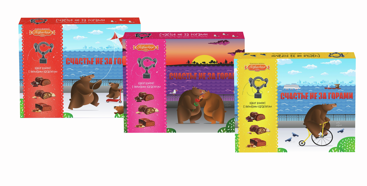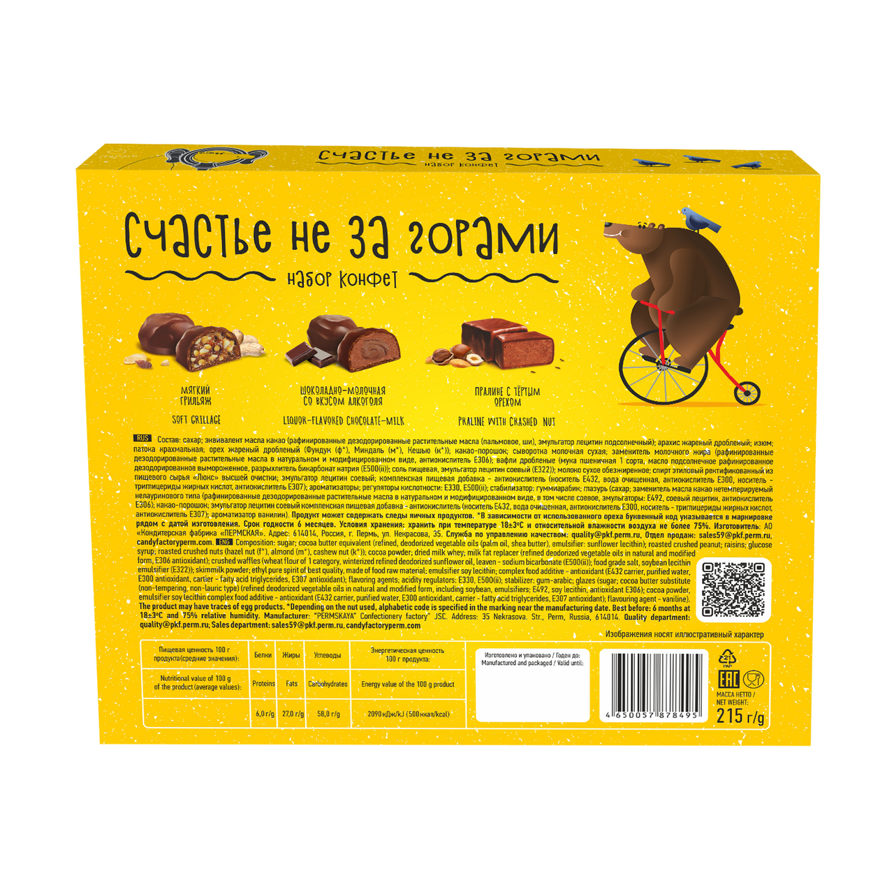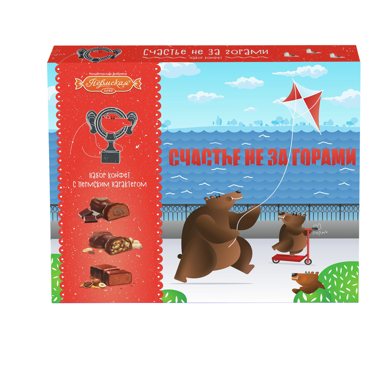 Включает в себя 3 вида конфет: глазированный мягкий грильяж из жареного арахиса с сочным изюмом; классическое пралине с добавлением дробленого фундука; сливочная помадная конфета с кремовой начинкой. Счастье не за горами – самая узнаваемая надпись, которая ассоциируется с Пермью у многих жителей России.