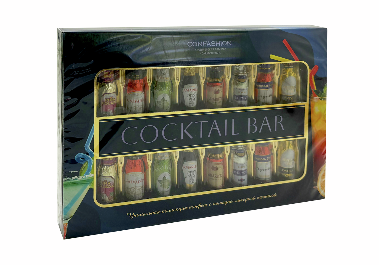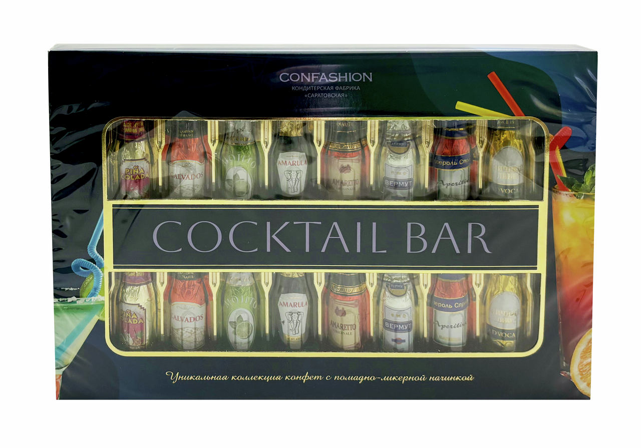 Набор из шоколадных конфет с помадной начинкой со вкусами наиболее известных алкогольных напитков. Набор из 16 шоколадных конфет в форме бутылочек с помадными начинками. В красиво оформленной коробке собраны 8 ярких коктейльных вкусов: апероль, вермут, мохито, пинаколада, амаретто, амарула, кальвадос, яичный ликер. Вкусные конфеты никого не оставят равнодушным и подарят отличное настроение.