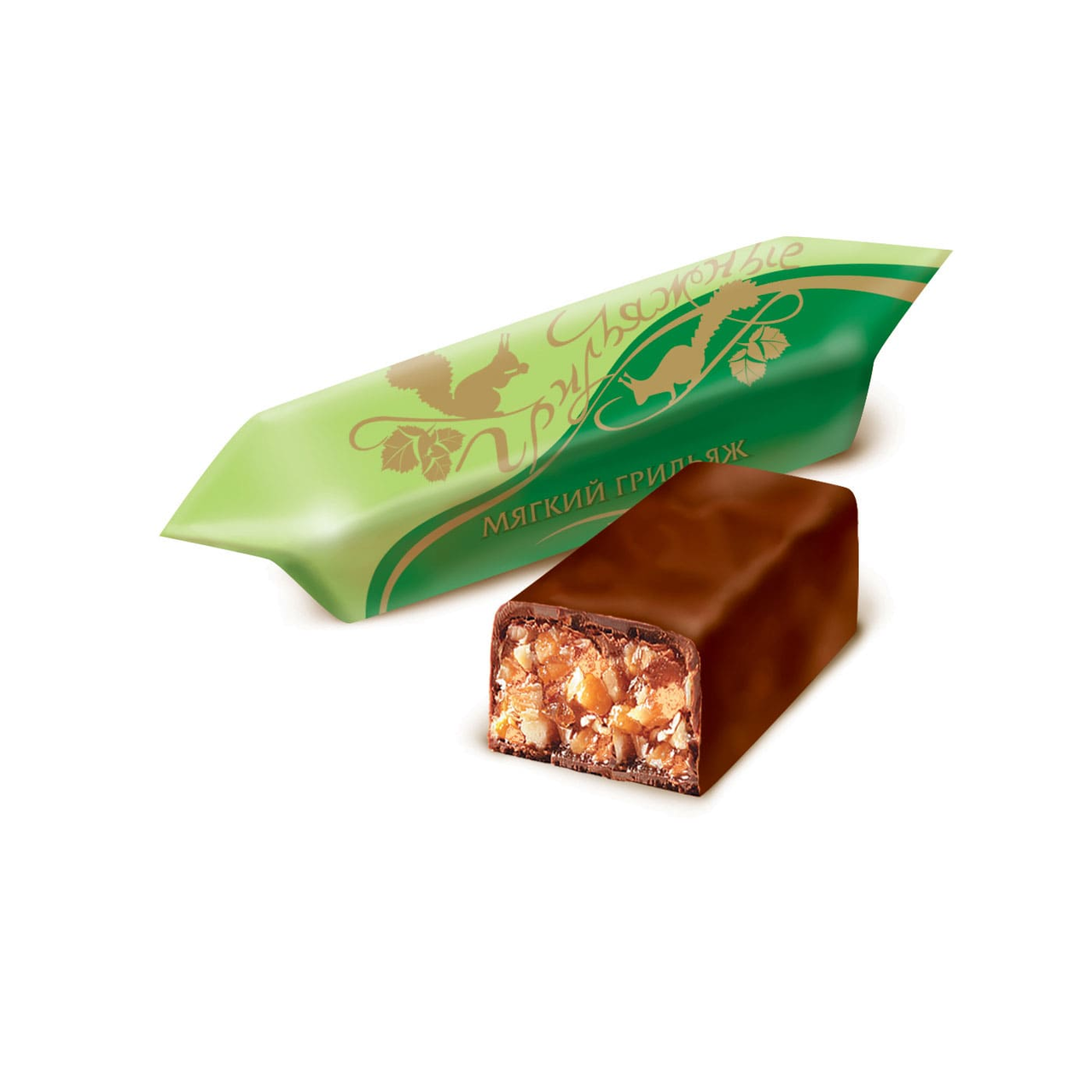 Конфеты Грильяжные мягкий грильяж – податливая нежная сладость от фабрики Красный октябрь. Щедрая порция дробленых орехов, соединенная в стройный кирпичик мягкой карамелью, напоминающей по текстуре нугу, покрыта слоем темной шоколадной глазури. Отличительная особенность обертки этих конфет – темно-зеленая волна на традиционном салатовом фоне.
