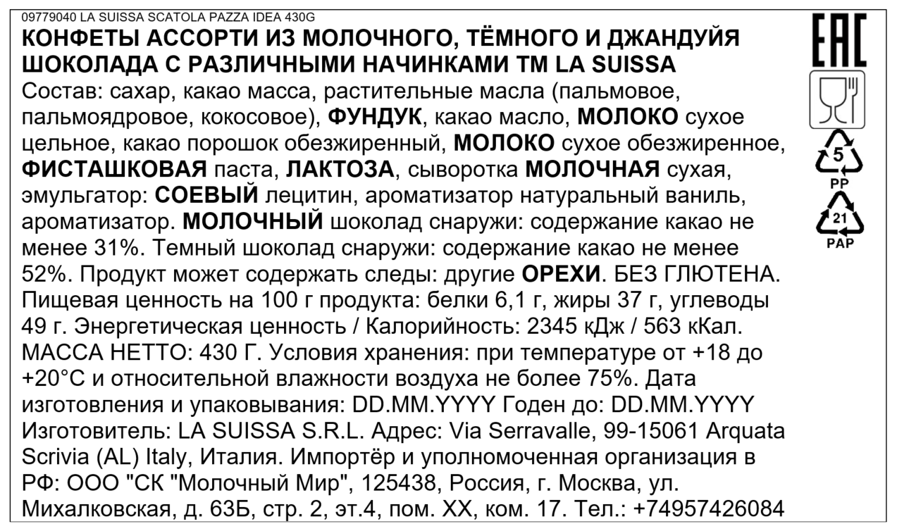Конфеты La Suissa шоколадные ассорти, 430г