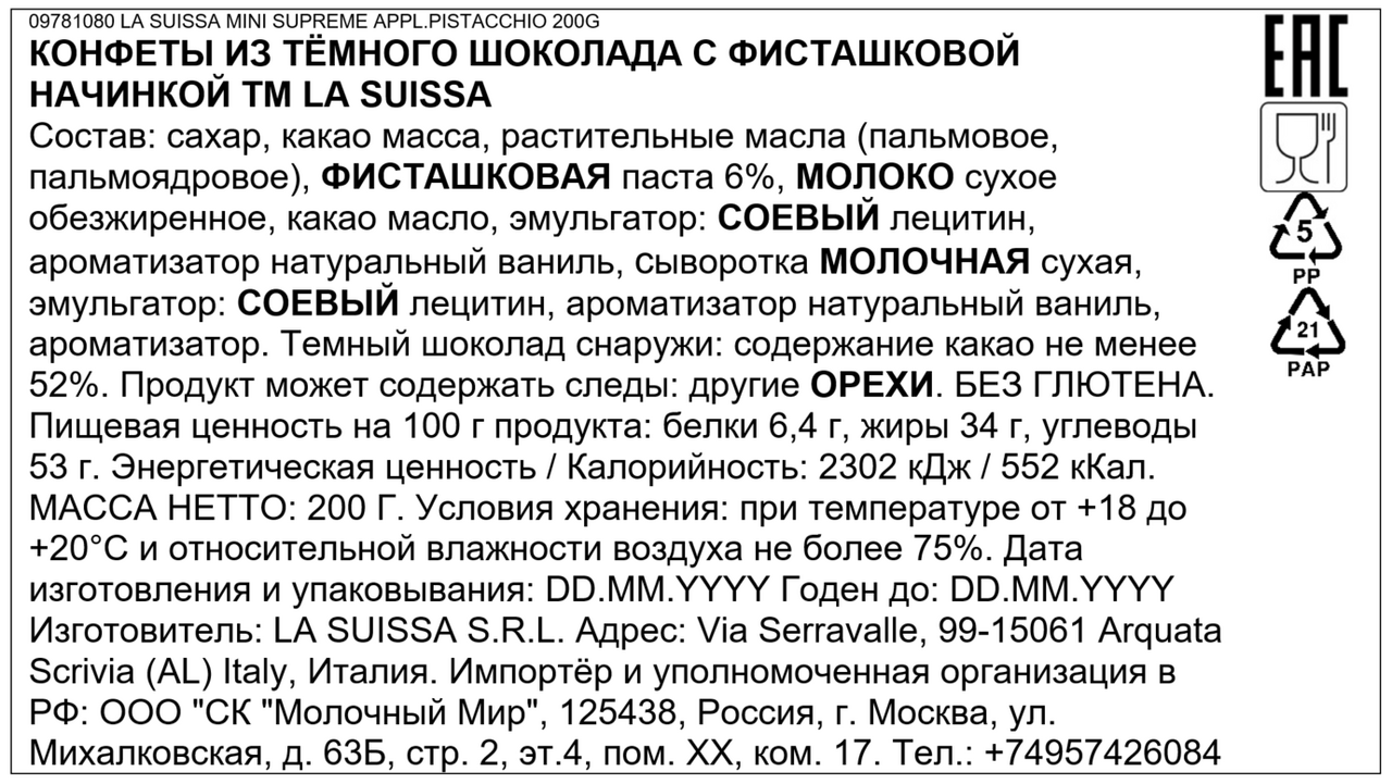 Сахар, какао тёртое, растительные жиры пальмовый и пальмоядровый, фисташковая паста, сухое обезжиренное молоко, какао-масло - сухая сыворотка молоко, эмульгатор: соевый лецитин, натуральный ванильный ароматизатор, отдушка.