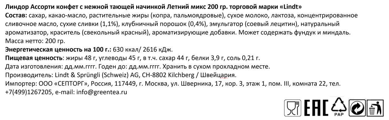 Конфеты Lindt Lindor Summer Mix шоколадные, 200г
