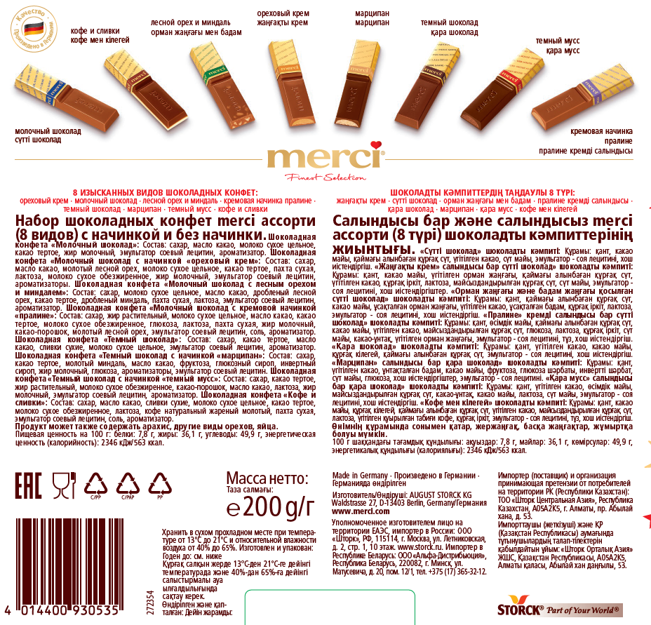 Сахар, какао-масло, какао тертое, цельное сухое молоко, растительный жир (пальмовый, дерева ши), кусочки лесных орехов, кусочки миндаля, сухие сливки, лактоза, сыворотка молочная (подсырная), сухая пахта, молочный жир, декстроза, сухое обезжиренное молоко, обезжиренное какао, эмульгатор: соевый лецитин, фруктоза, сироп глюкозы, кофе натуральный жареный молотый, инвертный сахарный сироп, натуральные ароматизаторы (экстракт ванили), соль поваренная пищевая. Молочный шоколад, молочный шоколад с начинкой из орехового крема, молочный шоколад с лесным орехом и миндалем, молочный шоколад с кремовой начинкой пралине: общий сухой остаток какао - не менее 32%, сухой обезжиренный остаток какао – не менее 3%, сухой обезжиренный остаток молока - не менее 14%, молочный жир - не менее 5%. Слой белого шоколада, слой кофейного шоколада: общий сухой остаток какао - не менее 28%, сухой обезжиренный остаток какао - не менее 4%, сухой обезжиренный остаток молока - не менее 12%, молочный жир - не менее 7%. Темный шоколад, темный шоколад с начинкой из марципана, темный шоколад с начинкой из темного мусса: общий сухой остаток какао - не менее 45%.
