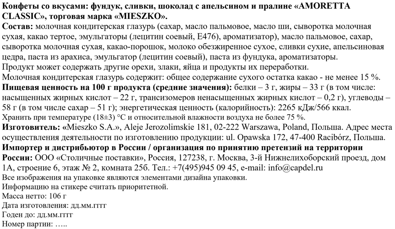 Конфеты Mieszko Amoretta Classic ассорти, 106г