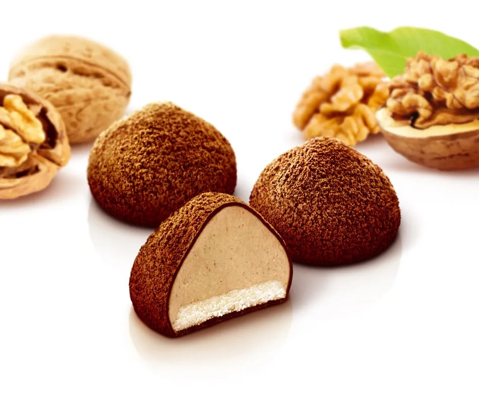Это уникальное сочетание вкусов. В основе каждой нежнейшее сливочно-шоколадное сердце на мягкой подушке из марципана – тертого миндального ореха. Сама трюфельная основа смешивается с протертым грецким орехом. Особенно хороши в тандеме с черным кофе. Они скрасят день и добавят яркую нотку в любое чаепитие, будут к месту на праздничном застолье.