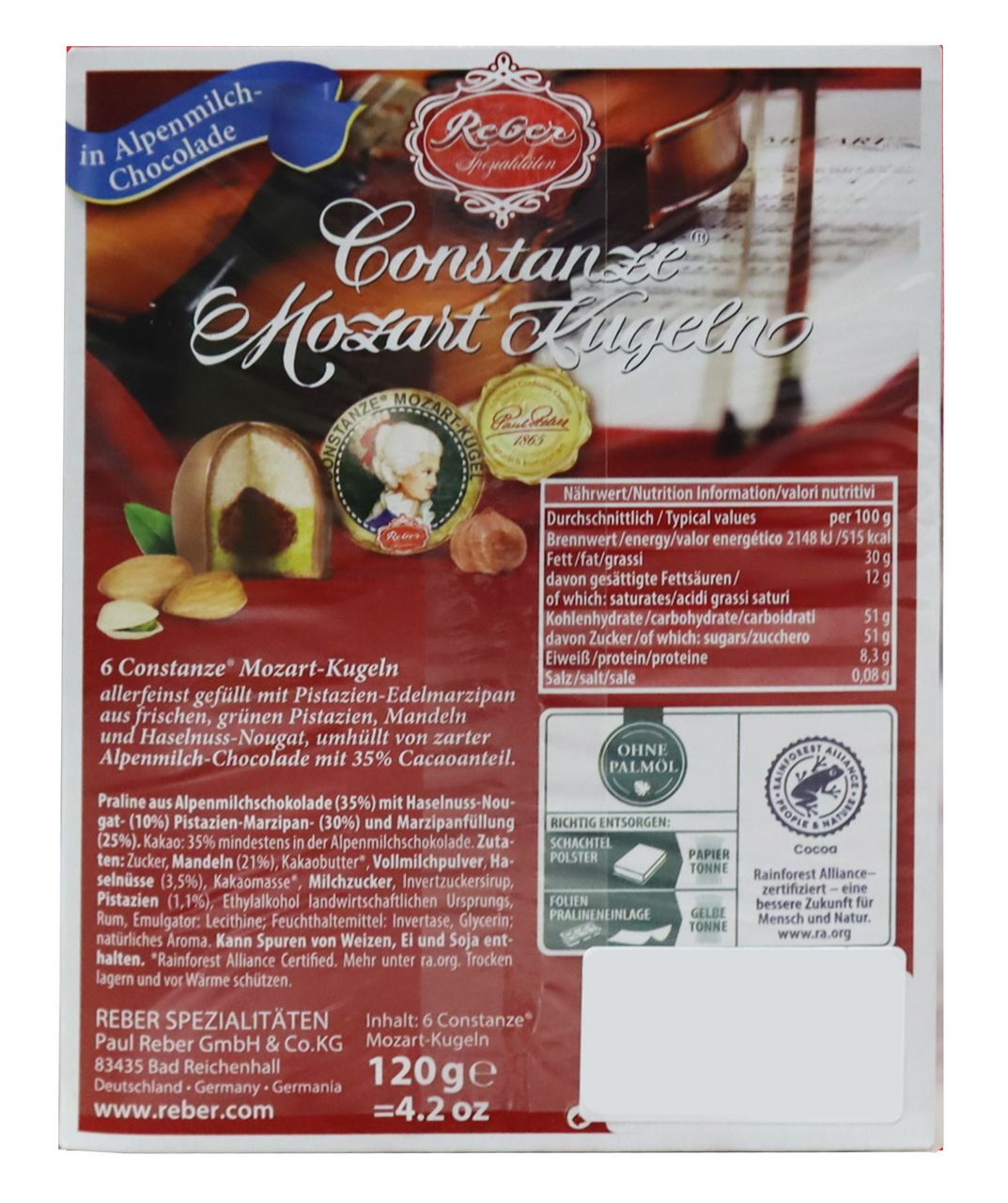 Знаменитые шоколадные конфеты Reber Mozart с начинкой из фисташкового марципана, покрытые молочным шоколадом - настоящий шедевр кондитерского искусства. Они подарят вам истинное наслаждение и станут приятным подарком в специальной упаковке.