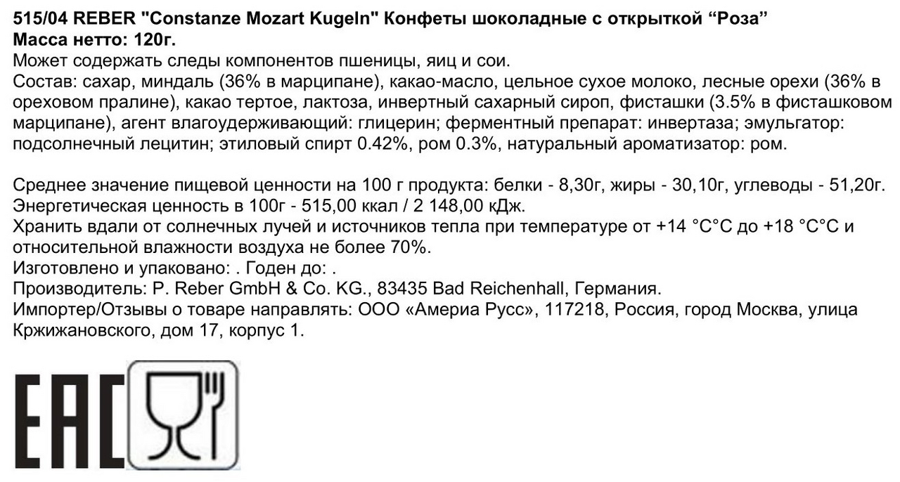 Конфеты Reber Mozart Kugeln шоколадные с открыткой роза, 120г