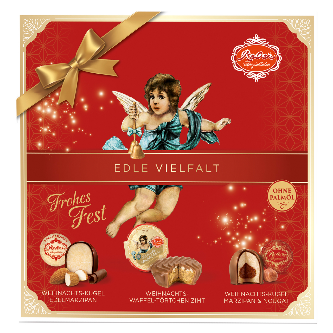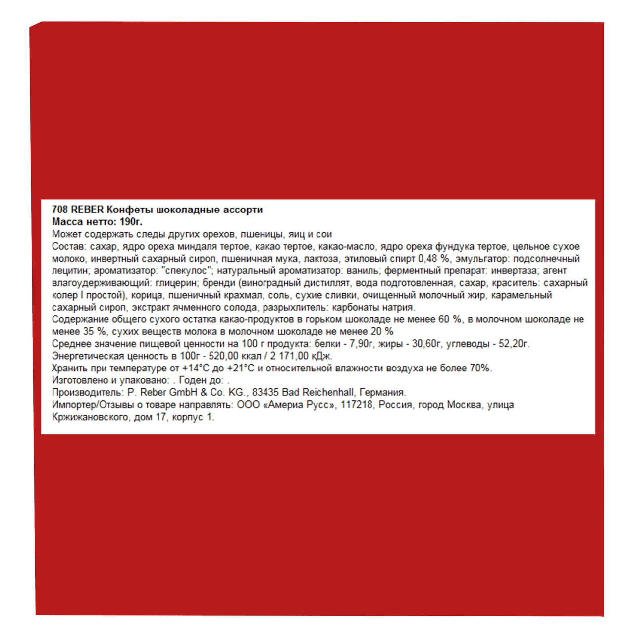 Шоколадные конфеты премиум класса от немецкого бренда Reber обладают безупречным и насыщенным вкусом, который приводит в восторг искушенных ценителей во всем мире. Конфеты изготовлены из натуральных ингредиентов без усилителей вкуса, ароматизаторов, искусственных красителей и консервантов. Каждая конфета в наборе завернута в золотистую фольгу с рисунком. Набор может стать идеальным подарком близкому человеку, коллеге по работе, учителю и бизнес-партнерам. Конфеты рекомендуется подавать в качестве десерта с горячим кофе или чаем.