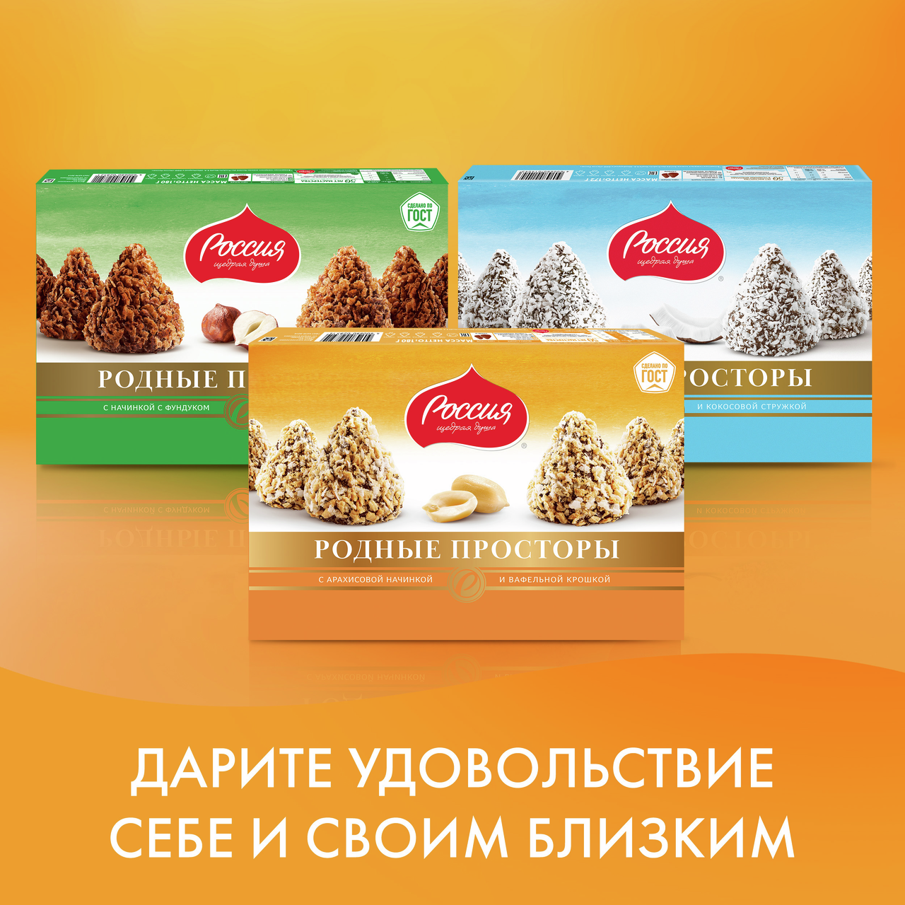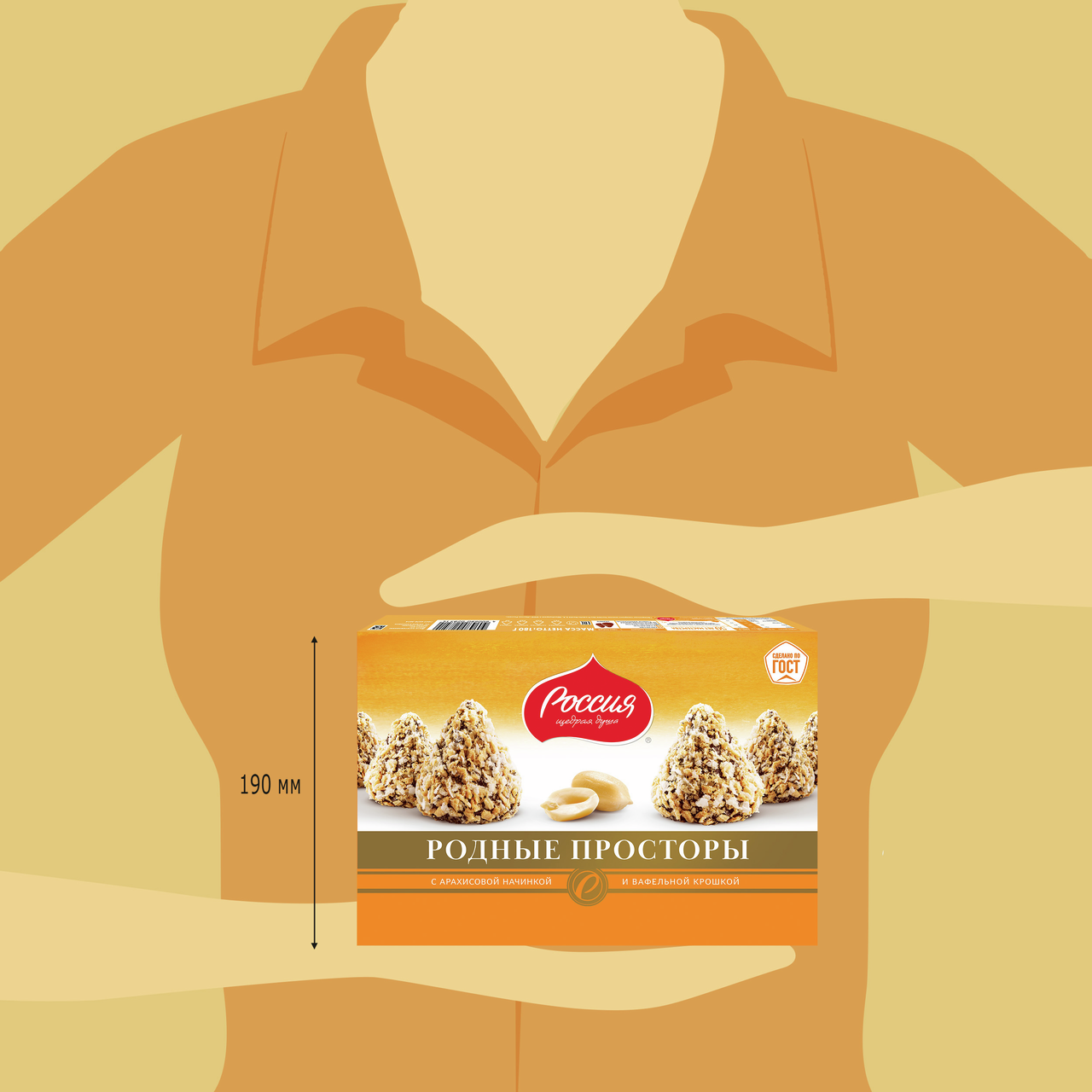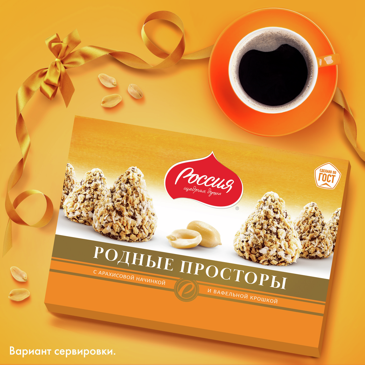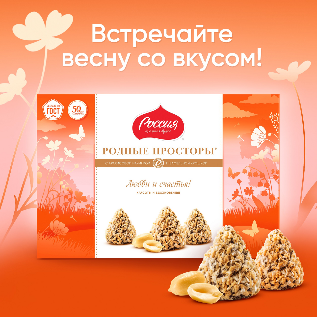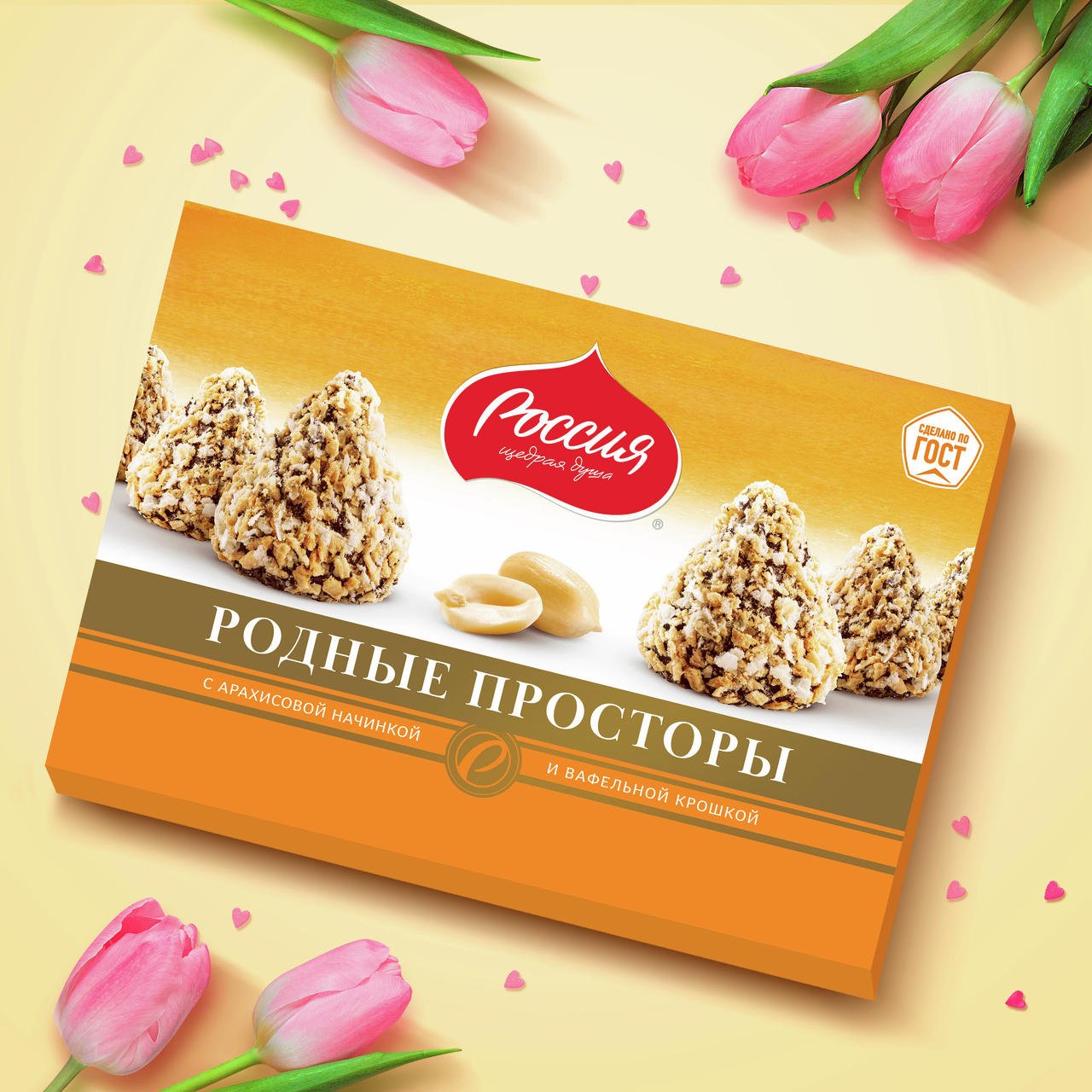Конфеты Родные Просторы с нежной начинкой с арахисом, покрытые шоколадной глазурью и хрустящей вафельной крошкой произведены по высоким стандартам качества ГОСТ. Лимитированный дизайн упаковки станет украшением любого торжества. Дарите удовольствие себе и своим близким!