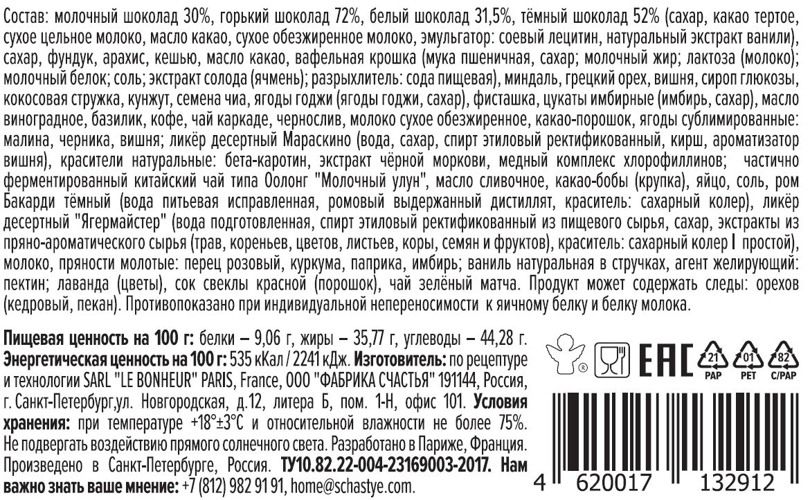 Молочный шоколад 30%, горький шоколад 72%, белый шоколад 31,5%, тёмный шоколад 52% (сахар, какао тертое, сухое цельное молоко, масло какао, сухое обезжиренное молоко, эмульгатор: соевый лецитин, натуральный экстракт ванили), сахар, фундук, арахис, кешью, масло какао, вафельная крошка (мука пшеничная, сахар; молочный жир; лактоза (молоко); молочный белок; cоль; экстракт солода (ячмень); разрыхлитель: сода пищевая), миндаль, грецкий орех, вишня, сироп глюкозы, кокосовая стружка, кунжут, семена чиа, ягоды годжи (ягоды годжи, сахар), фисташка, цукаты имбирные (имбирь, сахар), масло виноградное, базилик, кофе, чай каркаде, чернослив, молоко сухое обезжиренное, какао-порошок, ягоды сублимированные: малина, черника, вишня; ликёр десертный Мараскино (вода, сахар, спирт этиловый ректификованный, кирш, ароматизатор вишня), красители натуральные: бета-каротин, экстракт чёрной моркови, медный комплекс хлорофиллинов; частично ферментированный китайский чай типа Оолонг Молочный улун, масло сливочное, какао-бобы (крупка), яйцо, соль, ром Бакарди тёмный (вода питьевая исправленная, ромовый выдержанный дистиллят, краситель: сахарный колер), ликёр десертный Ягермайстер (вода подготовленная, спирт этиловый ректификованный из пищевого сырья, сахар, экстракты из пряно-ароматического сырья (трав, кореньев, цветов, листьев, коры, семян и фруктов), краситель: сахарный колер I простой), молоко, пряности молотые: перец розовый, куркума, паприка, имбирь; ваниль натуральная в стручках, агент желирующий: пектин; лаванда (цветы), сок свеклы красной (порошок), чай зелёный матча.
