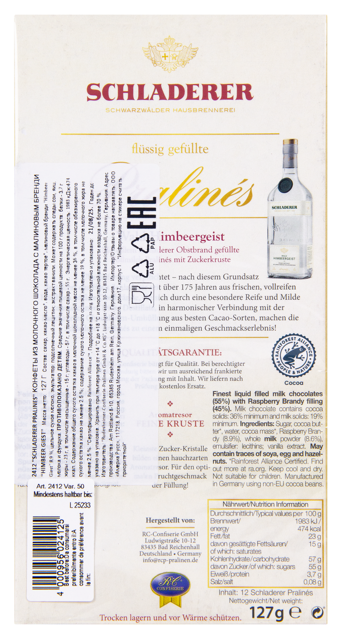 Конфеты Schladerer с молочным шоколадом и малиновым бренди, 127г