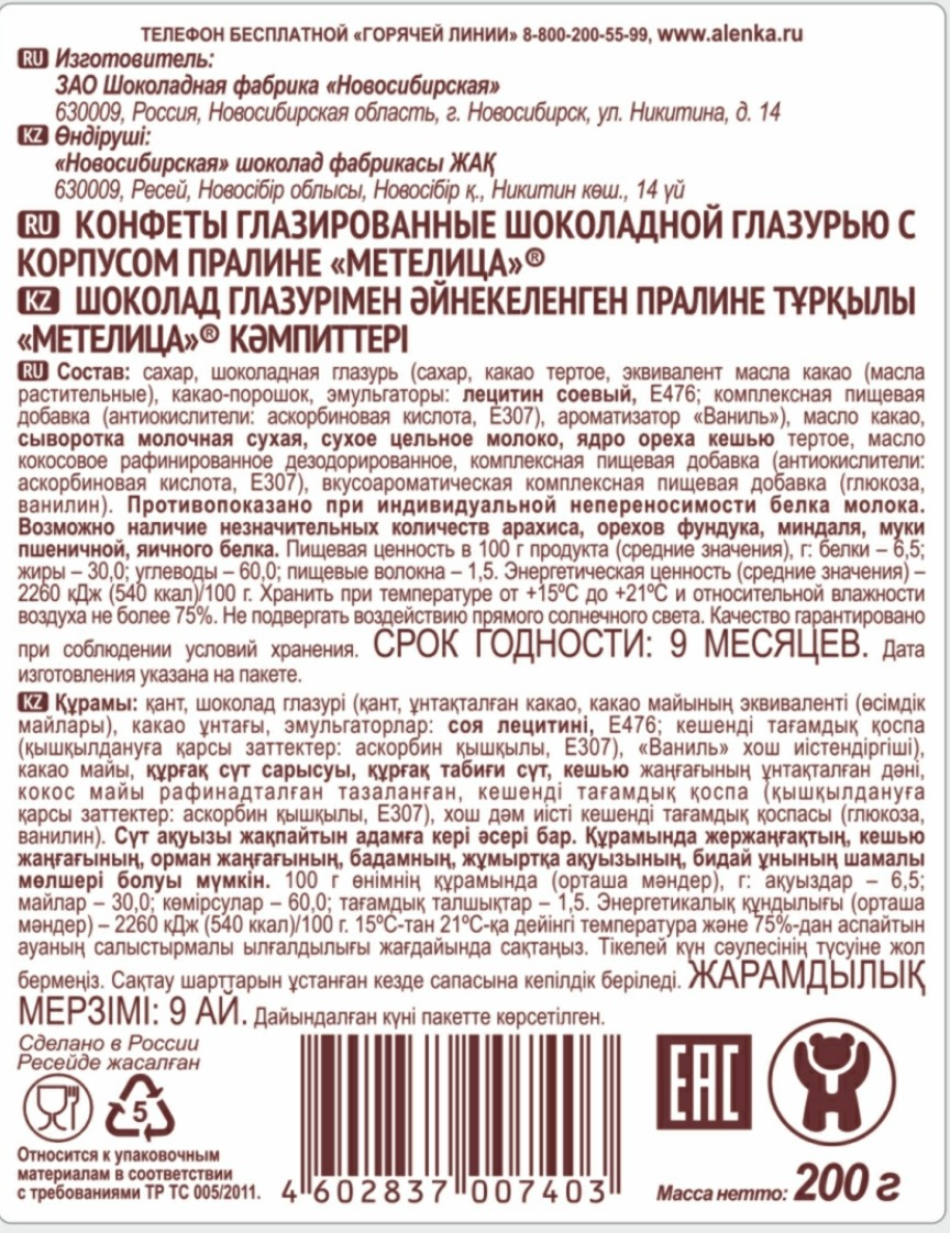 Сахар, шоколадная глазурь сахар, какао тёртое, эквивалент масла какао масла растительные, какао-порошок, эмульгаторы: лецитин соевый, Е476; комплексная пищевая добавка антиокислители: аскорбиновая кислота, Е307, ароматизатор Ваниль, масло какао, сыворотка молочная сухая, сухое цельное молоко, ядро ореха кешью тёртое, масло кокосовое рафинированное дезодорированное, комплексная пищевая добавка антиокислители: аскорбиновая кислота, Е307, вкусоароматическая комплексная пищевая добавка глюкоза, ванилин.