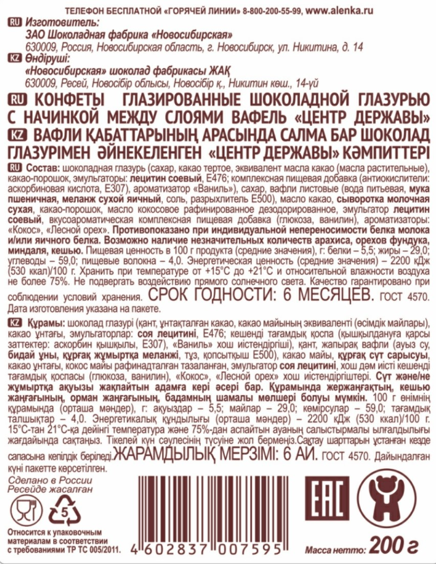 Шоколадная глазурь сахар, какао тёртое, эквивалент масла какао масла растительные, какао-порошок, эмульгаторы: лецитин соевый, Е476; комплексная пищевая добавка антиокислители: аскорбиновая кислота, Е307, ароматизатор Ваниль, сахар, вафли листовые вода питьевая, мука пшеничная, меланж сухой яичный, соль, разрыхлитель Е500, масло какао, сыворотка молочная сухая, какао-порошок, масло кокосовое рафинированное дезодорированное, эмульгатор лецитин соевый, вкусоароматическая комплексная пищевая добавка глюкоза, ванилин, ароматизаторы: Кокос, Лесной орех.