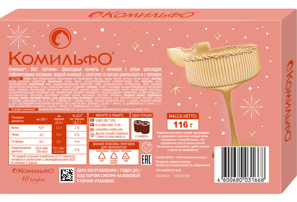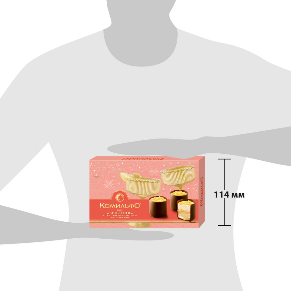 Изысканный подарок – конфеты Комильфо вкус "Беллини" для самых ярких моментов торжества! Изысканное сочетание формы и неповторимого вкуса для незабываемых моментов удовольствия. Новый праздничный лимитированный выпуск Белллини - это яркий коктейль вкуса, где в каждой конфете Комильфо восхитительная двуслойная начинка со вкусами игристого шампанского, с персиком, белым шоколадом и грейпфрутовыми кусочками в тонком обрамлении превосходного молочного шоколада. Насладитесь яркими моментами дегустации конфет Комильфо! Коробка выполнена в роскошном дизайне для самых торжественных моментов.