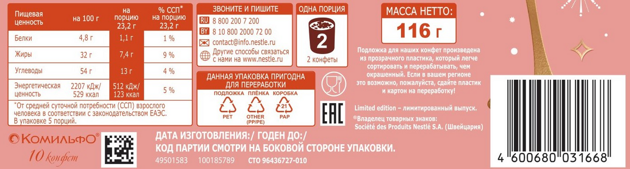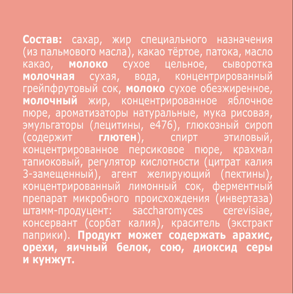 Сахар, жир специального назначения (из пальмового масла), какао тертое, патока, масло какао, молоко сухое цельное, сыворотка молочная сухая, вода, концентрированный грейпфрутовый сок, молоко сухое обезжиренное, молочный жир, концентрированное яблочное пюре, ароматизаторы натуральные, мука рисовая, эмульгаторы (лецитины, Е476), глюкозный сироп (содержит глютен), спирт этиловый, концентрированное персиковое пюре, крахмал тапиоковый, регулятор кислотности (цитрат калия 3 замещенный), агент желирующий (пектины), концентрированный лимонный сок, ферментный препарат микробного происхождения (инвертаза) штамм-продуцент: Saccharomyces cerevisiae, консервант (сорбат калия), краситель (экстракт паприки).