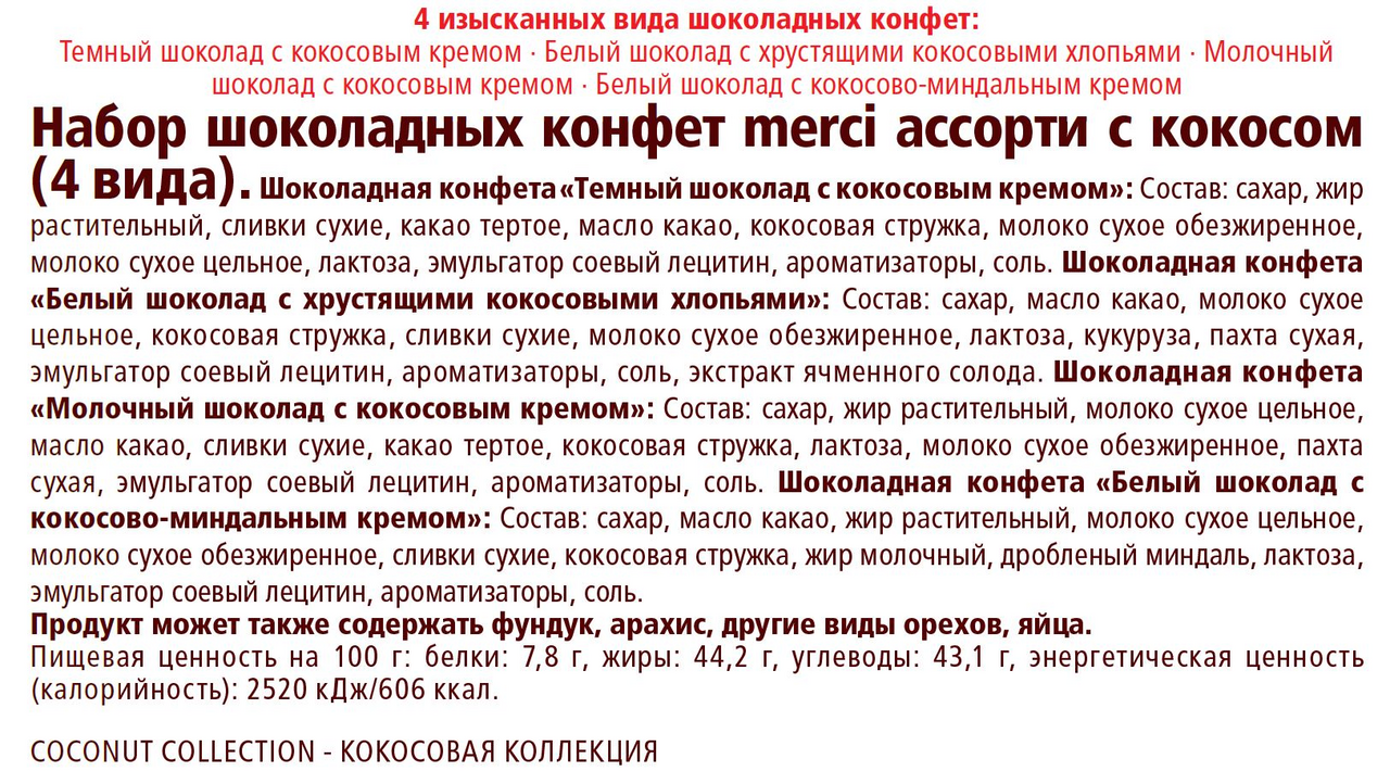 Сахар, жир растительный, сливки сухие, какао тертое, масло какао, кокосовая стружка, молоко сухое обезжиренное, молоко сухое цельное, лактоза, эмульгатор соевый лецитин, ароматизаторы соль.