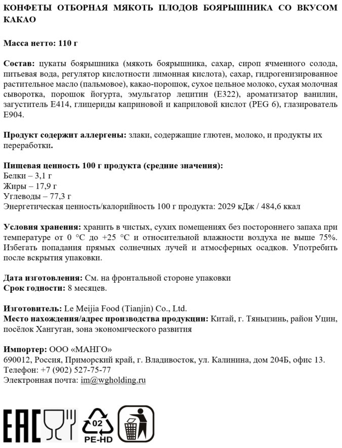 Конфеты Te Yi Shi какао и плоды боярышника, 110г