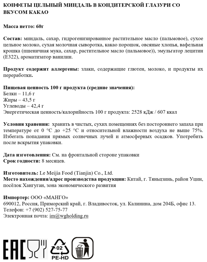 Конфеты Te Yi Shi миндаль в шоколадной глазури, 60г