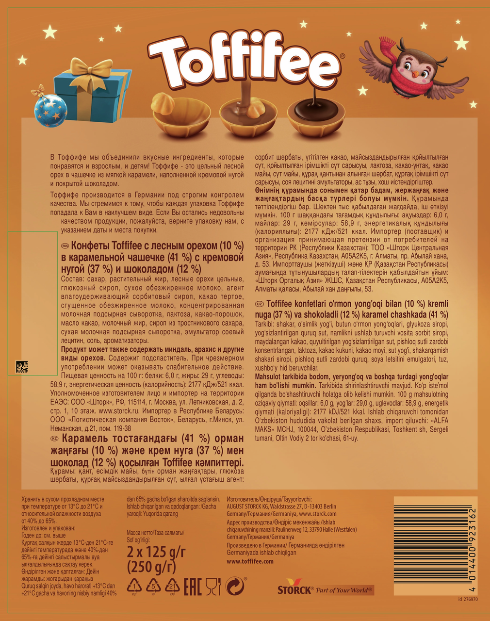 Набор конфет Toffifee Новый год, 250 г порадует маленьких и больших сладкоежек. Конфеты заключены в яркую упаковку. Такой набор, бесспорно, понравится всем без исключения. Его можно преподнести как оригинальный презент близким и родным в канун новогодних и рождественских праздников и просто украсить им торжественный стол. Сладости отлично сочетаются с чаем, кофе, какао. Конфеты и шоколад – неотъемлемая часть подарка на Новый год. Им обрадуются взрослые и маленькие сладкоежки. К тому же конфеты – отличная альтернатива калорийным пирожным и тортам и хорошая идея для похода в гости.