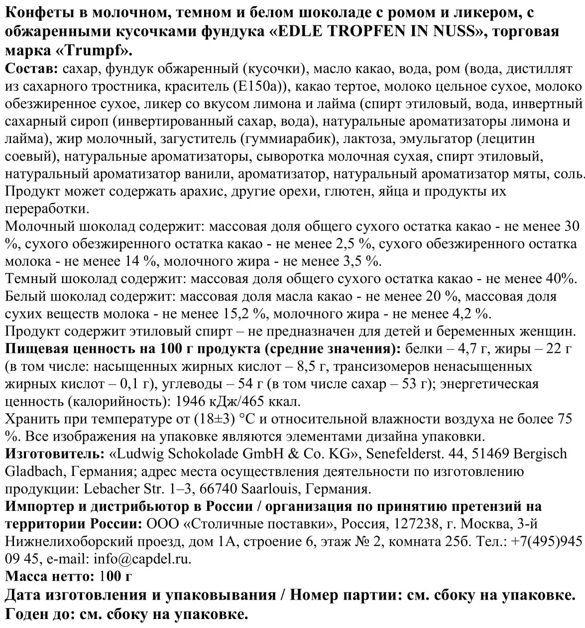 Конфеты Trumph Edle Tropfern in Nuss ром и ликер, 100г
