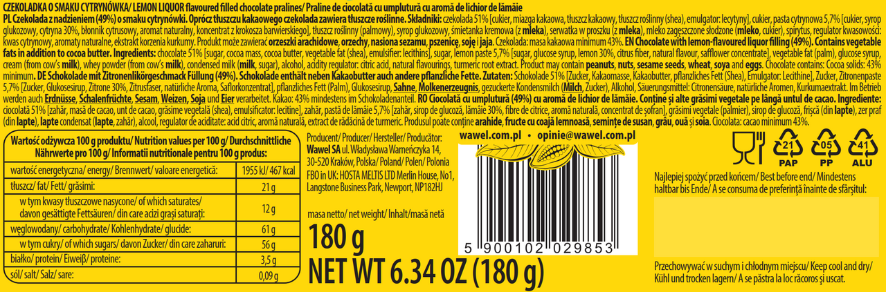 Конфеты Wawel шоколадные лимонный ликер, 180г