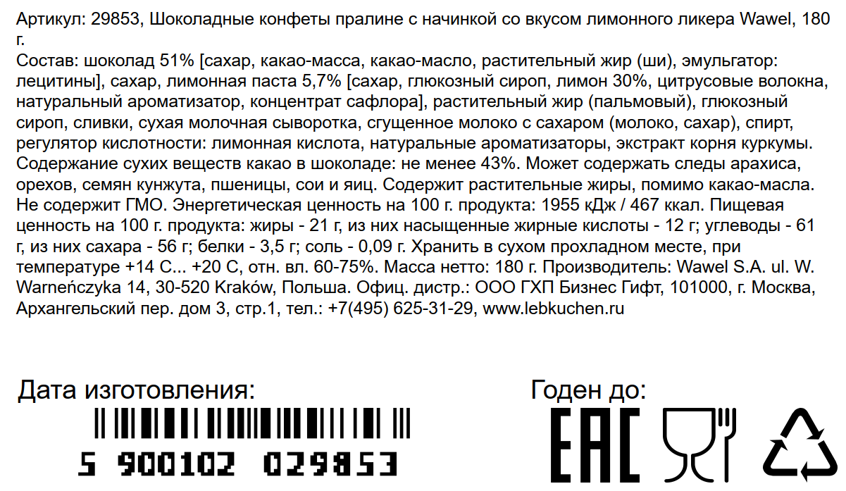Шоколад сахар, какао-масса, какао-масло, растительный жир ши, эмульгатор: лецитины, сахар, лимонная паста сахар, глюкозный сироп, лимон, цитрусовые волокна, натуральный ароматизатор, концентрат сафлора, растительный жир пальмовый, глюкозный сироп, сливки, сухая молочная сыворотка, сгущённое молоко с сахаром молоко, сахар, спирт, регулятор кислотности: лимонная кислота, натуральные ароматизаторы, экстракт корня куркумы.