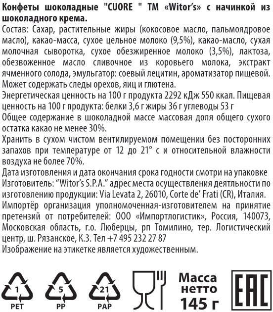 Конфеты Witor's Cuore шоколадные шоколадный крем, 145г
