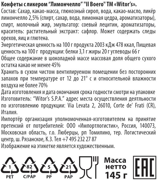 Сахар, какао-масса, глюкозный сироп, вода, какао-масло, ликёр лимончелло спирт, сахар, вода, лимонная цедра, ароматизаторы, спирт, молочный жир, эмульгатор: соевый лецитин, ароматизаторы, комплексная пищевая добавка на основе сафлора сахароза, вода, экстракт сафлора.