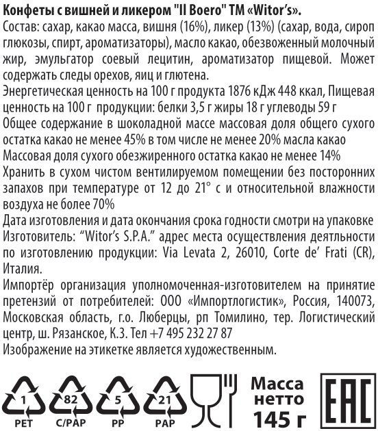 Конфеты Witor's Il Boreo шоколадные вишня и ликер, 145г