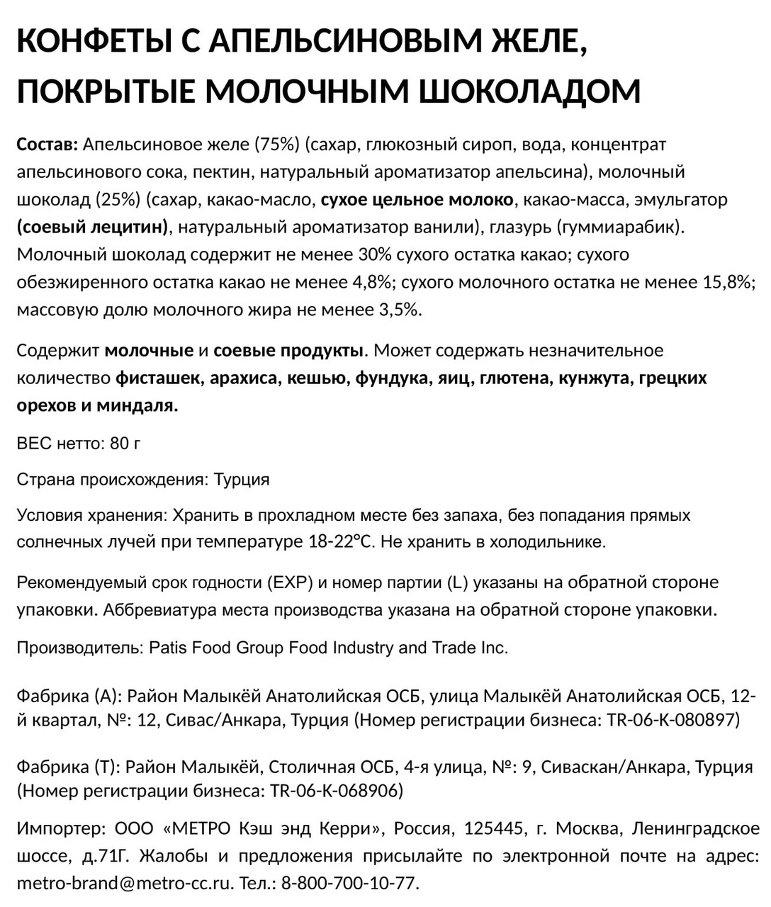 Конфеты Апельсиновое желе сахар, глюкозный сироп, вода, концентрированный апельсиновый сок, пектин, натуральный ароматизатор апельсина, молочный шоколад сахар, какао-масса, какао-масло, эмульгатор соевый лецитин, натуральный ароматизатор ванили, глазирующий агент гуммиарабик.