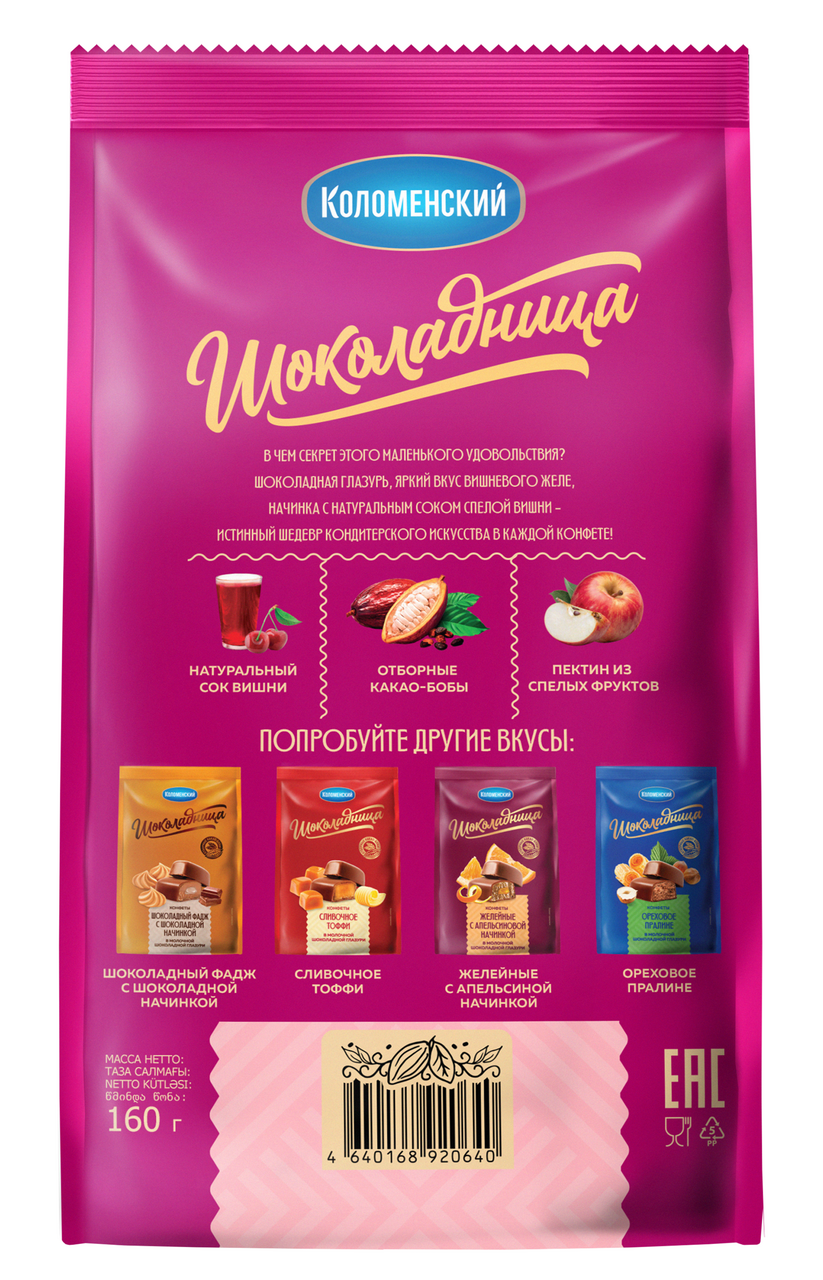 Шоколадная глазурь, яркий вкус вишневого желе, начинка с натуральным соком спелой вишни - истинный шедевр кондитерского мастерства. Конфеты Шоколадница дают возможность баловать себя каждый день, дарят наслаждение богатством вкуса молочной шоколадной глазури и разнообразием ярких начинок на любое настроение.