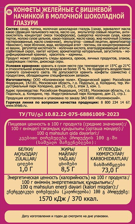 Сахар, патока, молочная шоколадная глазурь (сахар, эквивалент масла какао (фракция пальмового масла, масло ши, эмульгатор соевый лецитин, антиокислитель концентрат смеси токоферолов) сыворотка молочная сухая, какао тертое, молоко сухое цельное, какао-порошок, масло какао, жир молочный (сливки пастеризованные, масло сливочное), эмульгатор - соевый лецитин, ароматизатор Ванилин), пюре яблочное, вода, желирующий агент – пектины, сок концентрированный из вишни, регулятор кислотности - молочная кислота, влагоудерживающие агенты: сорбитовый сироп, лактат натрия, ароматизатор натуральный, загуститель - модифицированный крахмал, краситель – кармины.