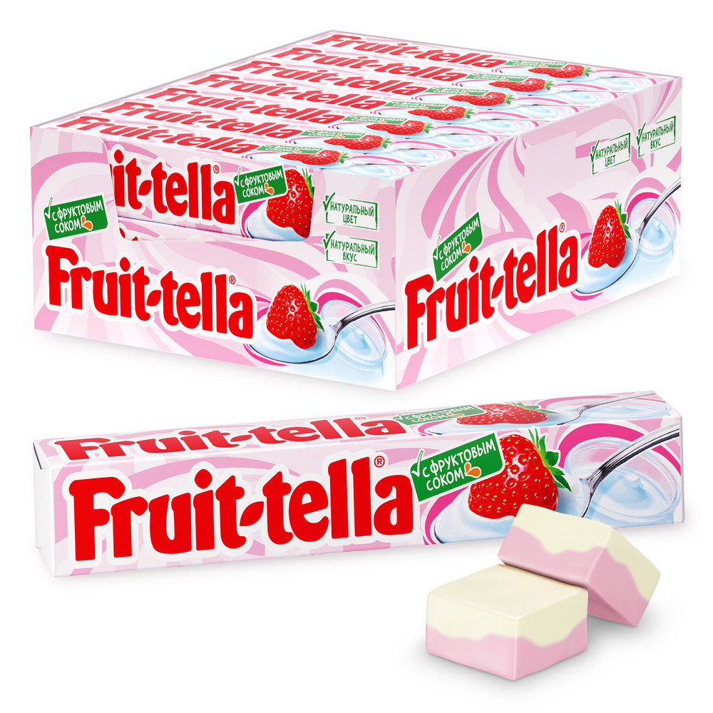 Любители фруктов вдохновили Fruittella на создание вкуснейших жевательных конфет с добавлением фруктового сока, приготовленных из натуральных ингредиентов. Нежное сочетание йогурта и вкуса сочной клубники создают неповторимую жевательную конфету Fruittella Клубника-Йогурт. Идеальна, чтобы наслаждаться самому и делиться с другими!