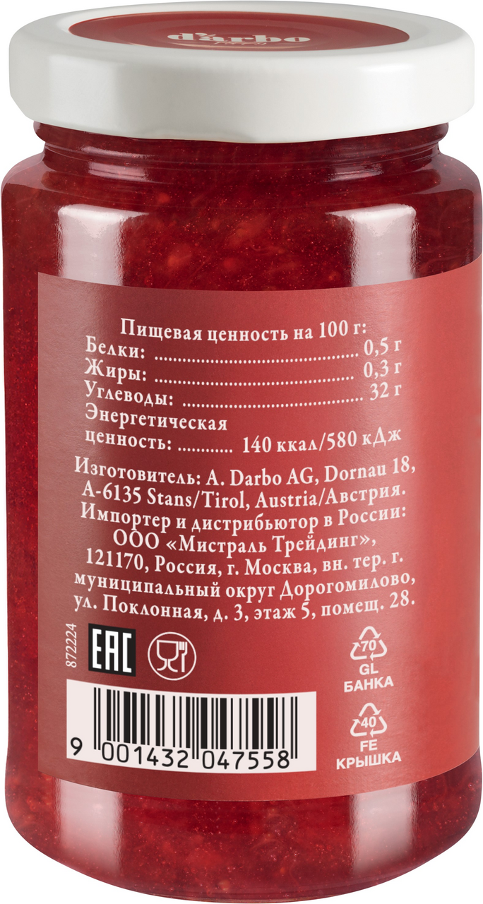Иногда меньше значит больше. Любой, кто хочет есть меньше сахара, будет рад конфитюру, где много фруктов. В ногу с тенденциями здорового образа жизни 80 % содержания фруктов и на 1/3 меньше сахара по сравнению с традиционными джемами. Не содержит заменителей сахара, консервантов и ароматизаторов. Darbo - международный бренд, зарекомендовавший себя на ведущих мировых рынка. Конфитюры с содержанием фруктов 80% изготовлены на высокотехнологичном заводе в Австрии. Только отборное сырье из лучших регионов мира. Высокий процент содержания натуральных фруктов и ягод.