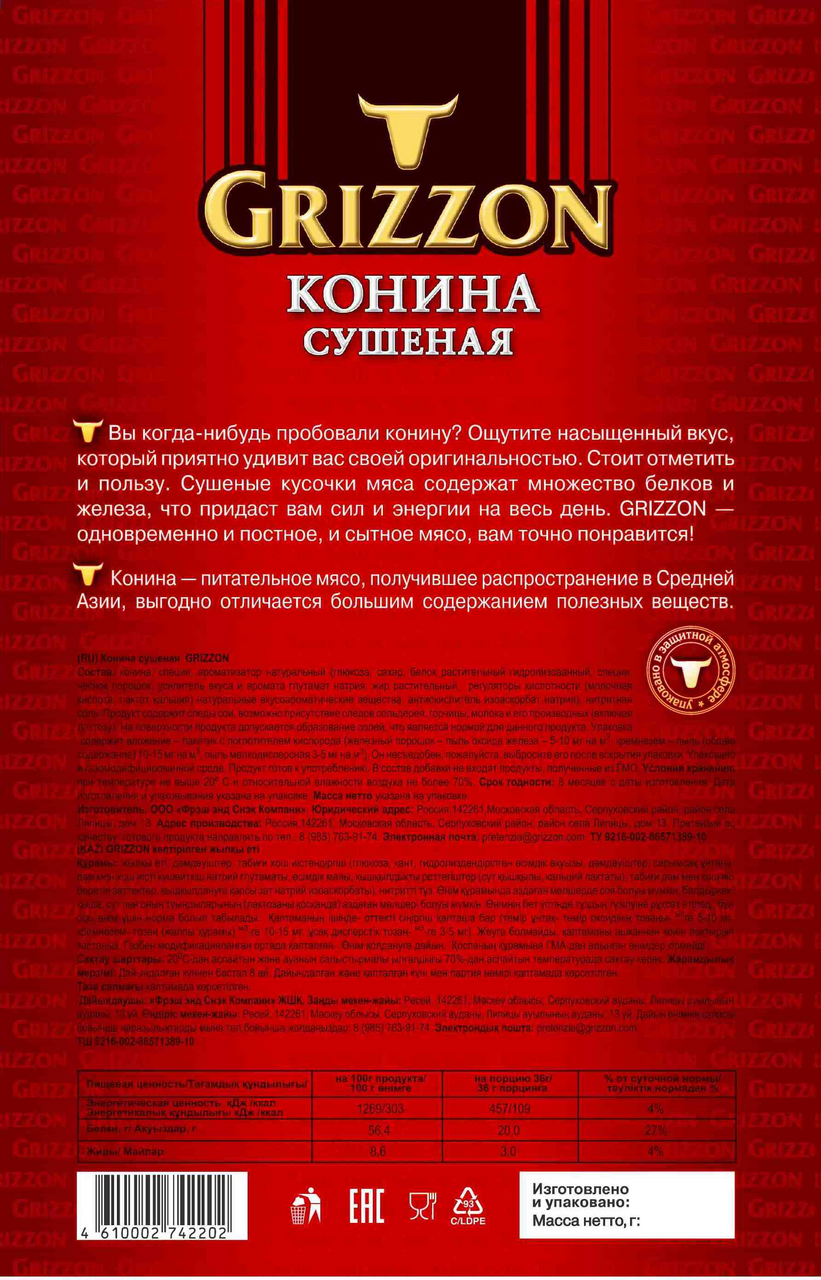 Конина - питательное мясо, получившее распространение в Средней Азии, выгодно отличается большим содержанием полезных веществ. Ощутите насыщенный вкус, который приятно удивит вас своей оригинальностью. Стоит отметить и пользу. Сушеные кусочки мяса содержат множество белков и железа, что придаст вам сил и энергии на весь день. Grizzon - одновременно и постное, и сытное мясо, вам точно понравится.