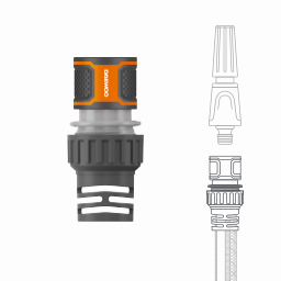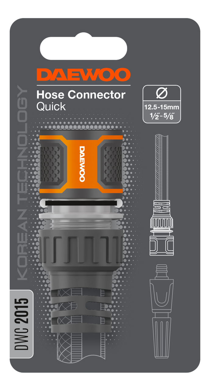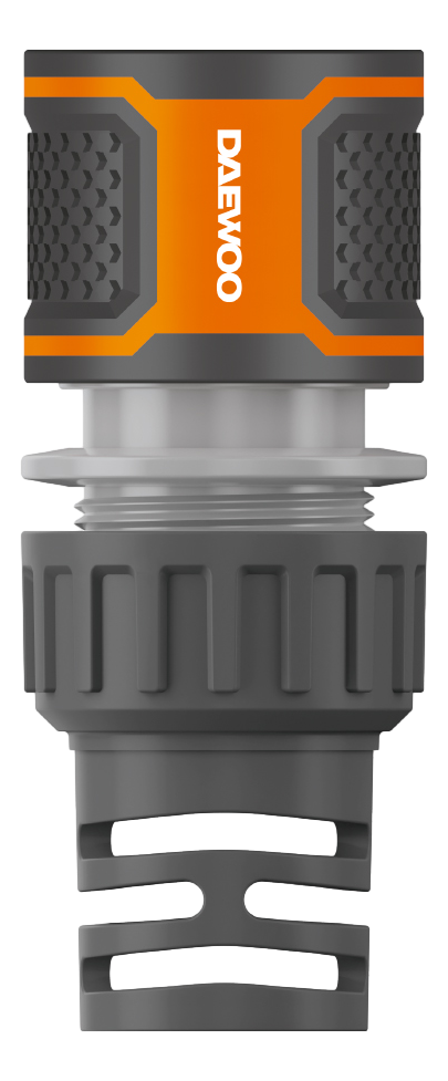 Позволяет быстро подключить шланг диаметром 13-15мм (1/2-5/8) к разбрызгивателю или другой насадке. Изготовлен из ударопрочного ABS пластика для долгого срока службы. Прорезиненные поверхности и эргономичная форма для удобной эксплуатации. Надёжный 3х-лепестковый замок и жесткая металлическая пружина обеспечивают плотную фиксацию штуцера, что исключает протекание воды в соединении. Совместим с базовой системой полива Daewoo и других производителей. Удлинённый хвостовик препятствует заломам и повреждению шланга в месте крепления. Фиксаторы шланга выполнены из эластичного полипропилена и гарантируют крепкое соединение даже при высоком давлении.