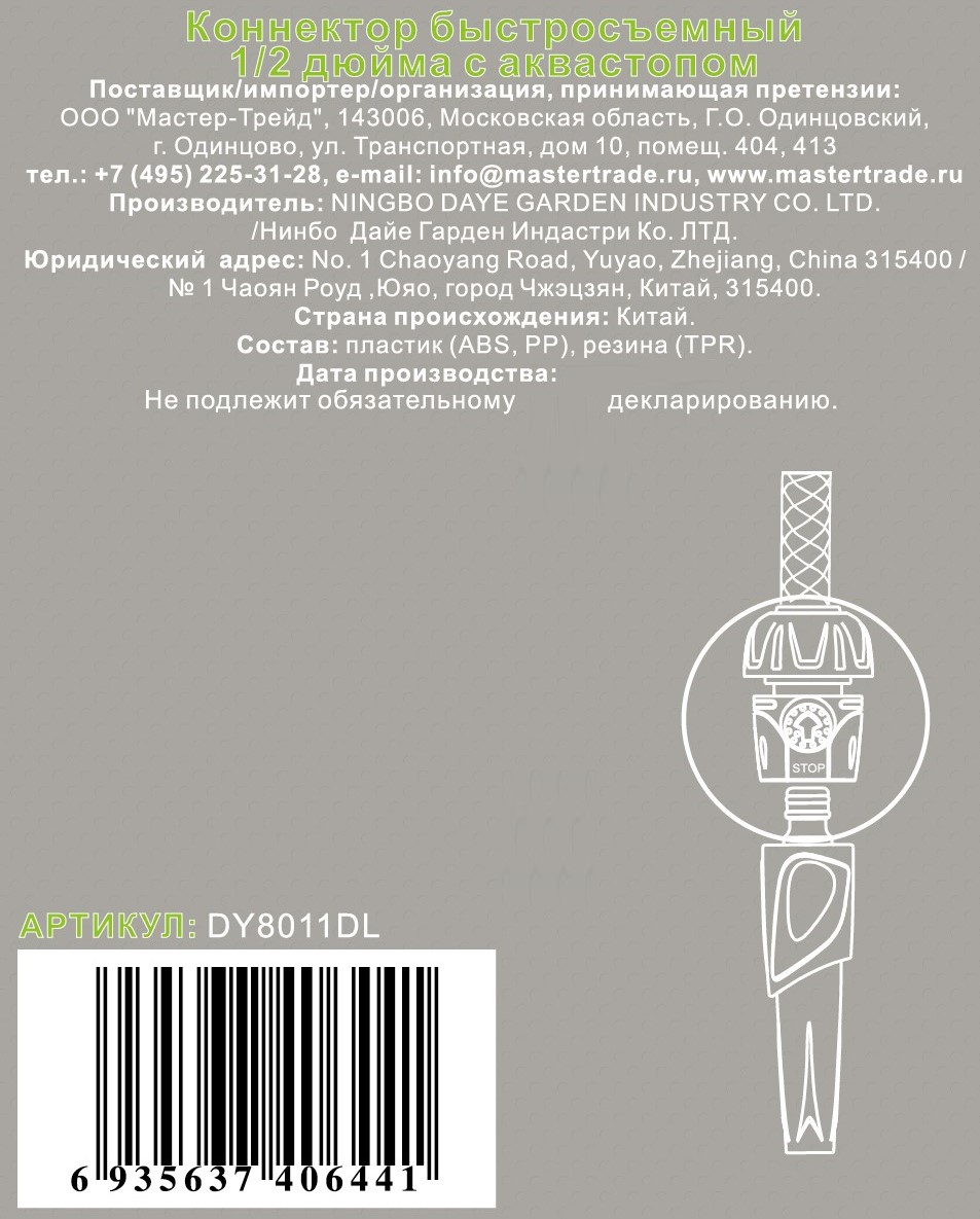 Коннектор быстросъемный 1/2 дюйма с аквастопом изготовлен из РР - полипропилен + АБС-пластик - ударопрочная техническая термопластическая смола на основе сополимера акрилонитрила с бутадиеном и стиролом + TPR или термопластичная резина.