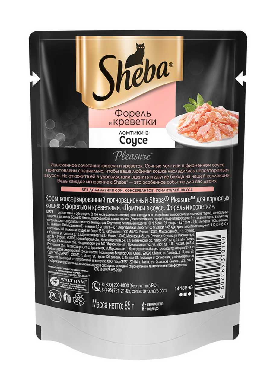 Корм влажный Sheba Pleasure Ломтики в соусе для взрослых кошек с форелью и креветками, 85г