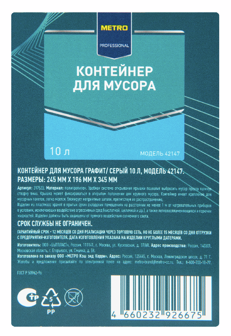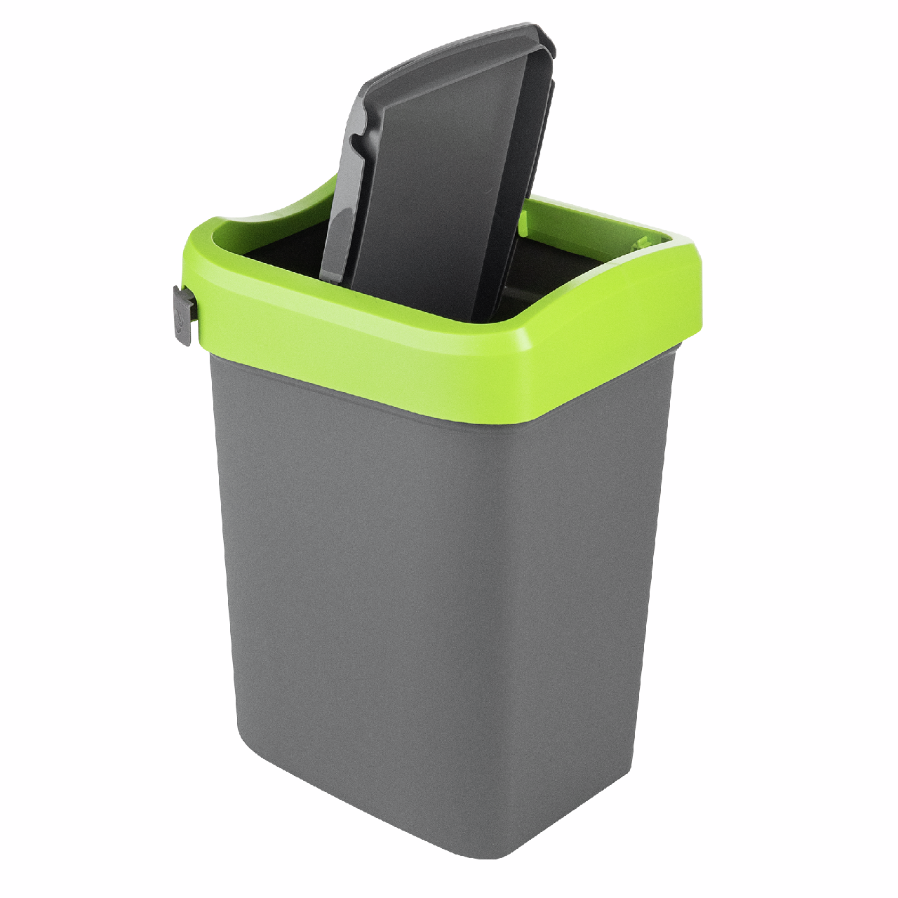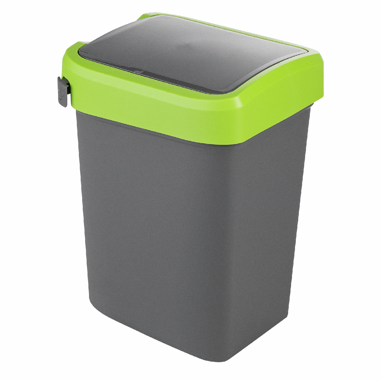 METRO PROFESSIONAL Контейнер для мусора графитно-зеленый, 25 x 20 x 35 см, 10 л изготовлен из прочного пластика. Удобная система открывания крышки позволит выбросить мусор в ведро даже с занятыми руками, просто толкнув створку вниз. Крышка может фиксироваться в открытом положении для крупного мусора. Цветовая дифференциация ободов незаменима для организации раздельного сбора мусора дома. Контейнер для раздельного сбора мусора имеет специальное крепление для мусорных пакетов, легко моется, блокирует неприятные запахи, препятствуя их распространению. Контейнер отлично подойдет для использования в офисе и гармонично впишется в современный домашний интерьер.