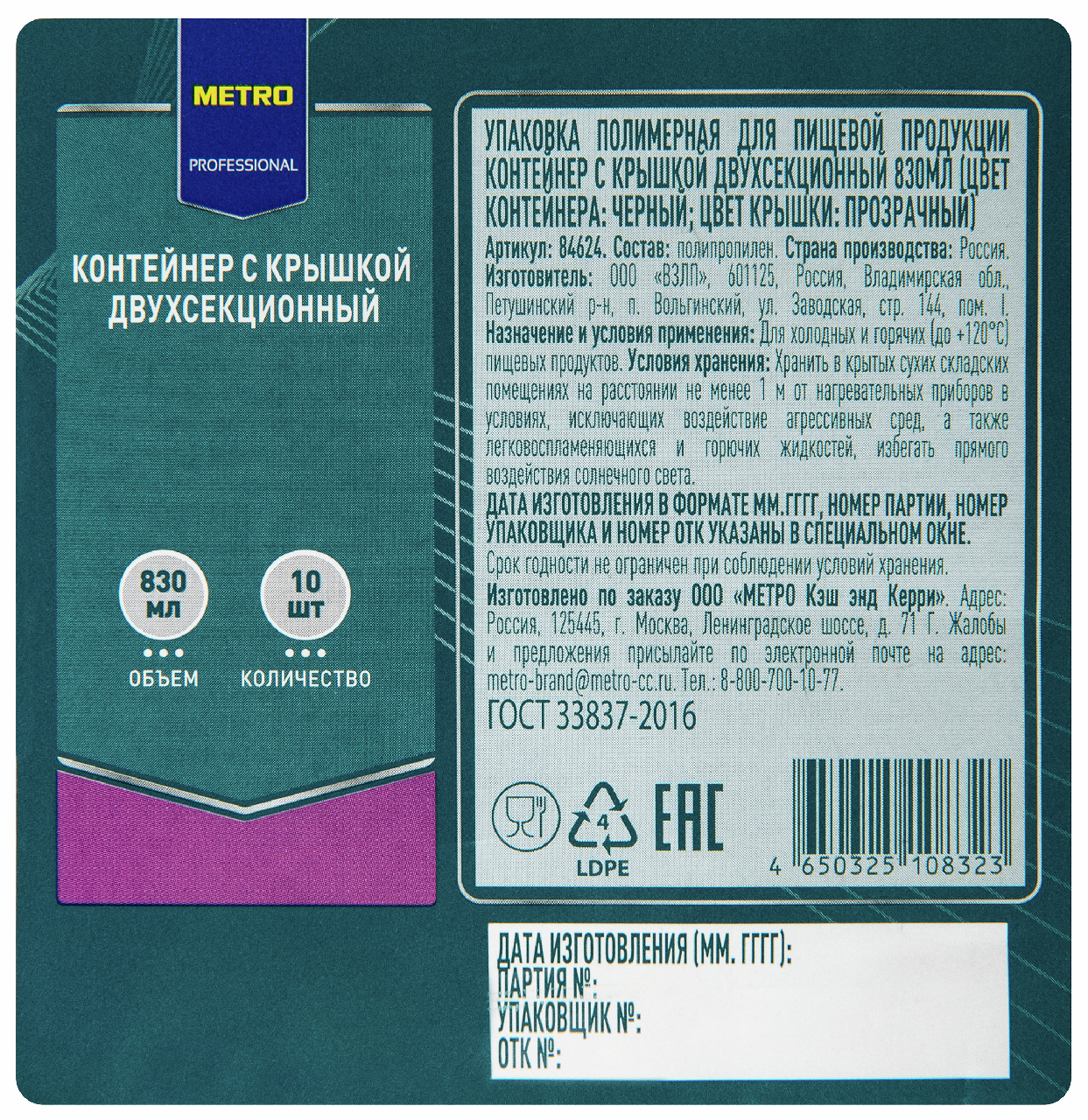 METRO PROFESSIONAL Контейнер + крышка, 830 мл х 10 шт. экономит место при хранении и транспортировке продуктов. Он удобен и практичен. Незаменимый помощник на кухне и в повседневной жизни. Может использоваться для упаковки еды на вынос, а также для организации питания в офисе или на даче. Поставляется в комплекте с крышкой. Это надежное решение для сохранения свежести и вкуса ваших продуктов. За изделием легко ухаживать. Контейнер поможет решить проблему надежного хранения и безопасной переноски продуктов. Его удобно использовать на автоматических линиях, благодаря возможности запайки. Это особенно полезно для предприятий пищевой промышленности, которые массово производят и упаковывают продукты. Емкость проходит пастеризацию и стерилизацию, что обеспечивает максимальную герметичность упакованной пищи. Прозрачный материал позволяет видеть содержимое контейнера без необходимости его открывать. Это удобно в случае использования нескольких контейнеров одновременно. Емкость прочная и легко моется. Контейнер подходит для продуктов, которые требуют специальных условий хранения или должны быть сохранены длительный срок. Обеспечивает герметичность, сохраняет свежесть и вкус блюда, исключает протекание и неприятные запахи. Он изготовлен из безопасного полипропилена, поэтому подходит для разогрева в СВЧ.