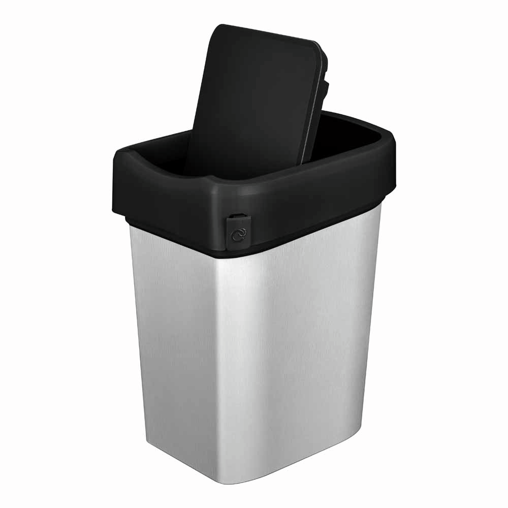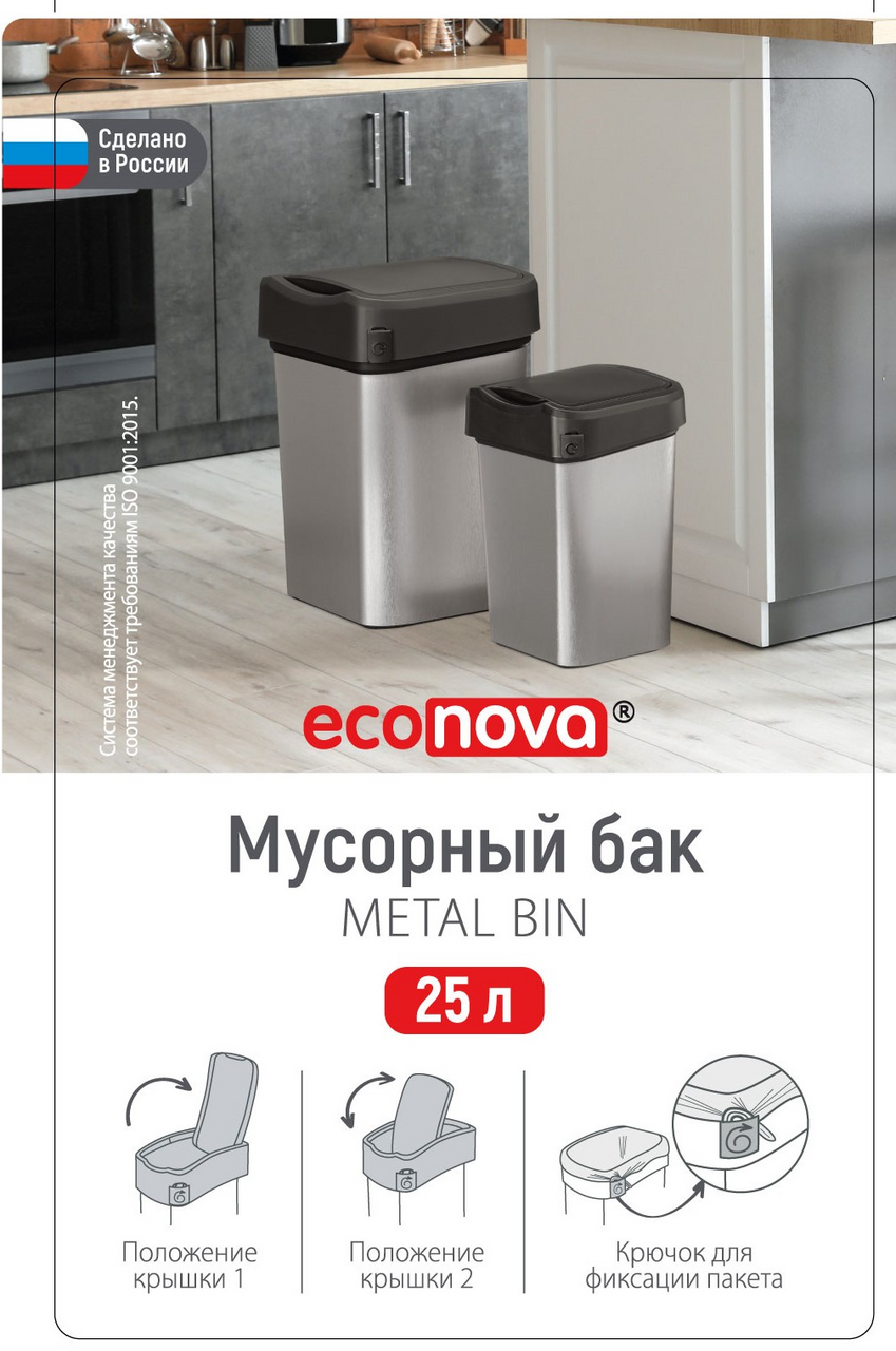 Контейнер для раздельного сбора мусора Metal Bin 25л от бренда Econova изготовлен из прочного пластика. Удобная система открывания крышки позволит выбросить мусор в ведро даже с занятыми руками, просто толкнув створку вниз. Крышка может фиксироваться в открытом положении для крупного мусора. Контейнер для раздельного сбора мусора Metal Bin 25л имеет специальное крепление для мусорных пакетов, блокирует неприятные запахи, препятствуя их распространению. Благодаря стильной металлизированной поверхности контейнер гармонично впишется в интерьер кухни, ванной, спальни, офиса и любого другого помещения. Поверхность контейнера легко моется, на ней не остается разводов. На дне контейнеров 25л имеется специальное углубление для удобного высыпания мусора.