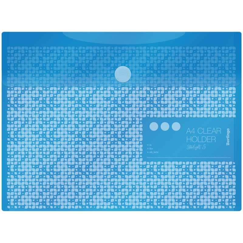 Папка-коверт BERLINGO Starlight, А4, 180 мкм изготавливается из полупрозрачного плотного пластика, имеющего яркую расцветку. Используют для переноски или хранения документов, обеспечивая защиту от смятия и загрязнения. На каждом конверте, имеющем горизонтальную ориентацию, располагают индивидуальную наклейку с общей информацией. Изделие закрывается плотно с помощью кнопки. Производитель отпускает товар упаковками, с продукцией одного цвета.