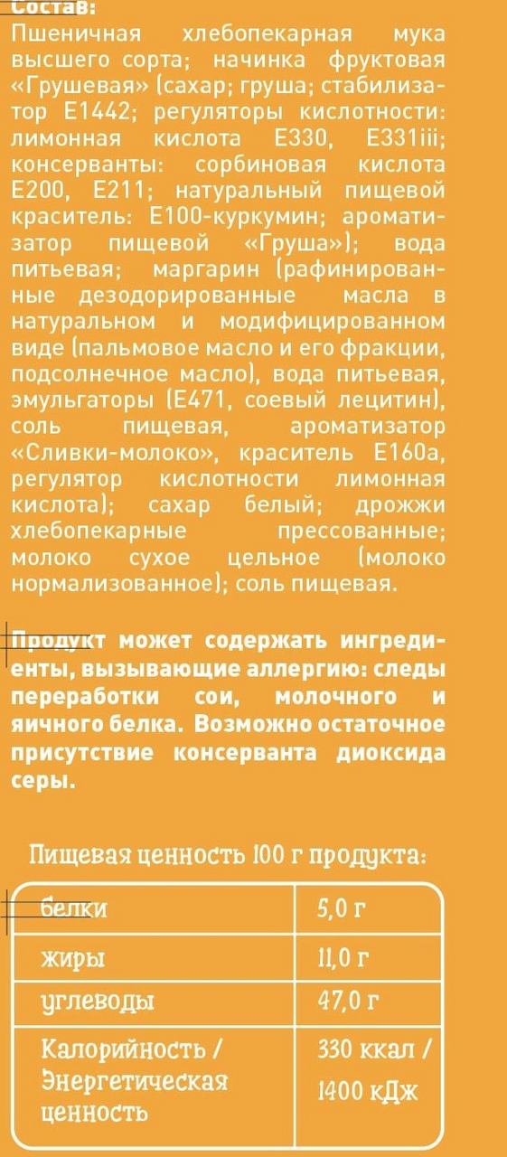 Пшеничная хлебопекарная мука высшего сорта; конфитюр Груша (груша, сахар, загуститель: модифицированный крахмал, консерванты: бензоат натрия, сорбат калия, регулятор кислотности: лимонная кислота, ароматизатор идентичный натуральному Груша), вода питьевая; маргарин (рафинированные дезодорированные масла в натуральном и модифицированном виде(пальмовое масло и его фракции, подсолнечное масло) вода питьевая, эмульгаторы (Е471, соевый лецитин), соль пищевая, ароматизатор Сливки-молоко, краситель Е160a, регулятор кислотности лимонная кислота); сахар белый; дрожжи хлебопекарные прессованные; молоко сухое цельное (цельное молоко, обезжиренное молоко); соль поваренная пищевая.