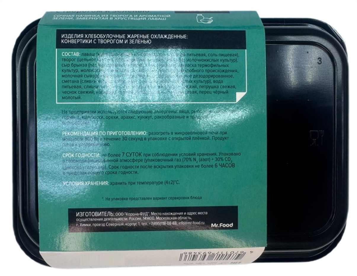 Лаваш (мука пшеничная хлебопекарная высшего сорта, вода питьевая, соль пищевая), творог м.д.ж. 9% (молоко цельное, молоко обезжиренное, закваска (смесь лактококков и термофильных молочнокислых стрептококков), молокосвертывающий фермент микробного происхождения), сыр мягкий м.д.ж. в сухом веществе 45% (пастеризованное молоко, соль пищевая, закваска лиофилизированных культур, молокосвертывающий ферментный препарат микробного происхождения, молочная сыворотка), масло подсолнечное рафинированное дезодорированное, сметана м.д.ж. 20% (сливки нормализованные, закваска молочнокислых культур), сливки питьевые пастеризованные м.д.ж. 10%, лук зелёный свежий, укроп свежий, кориандр свежий (кинза) зелень, петрушка свежая, чеснок свежий, соль пищевая, перец чёрный молотый.