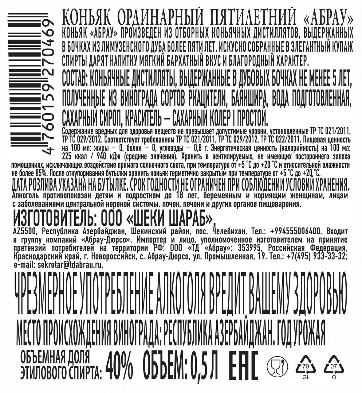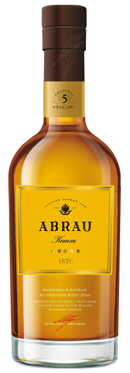 Abrau 5 Years Old - азербайджанский коньяк, изготовленный из отборных коньячных дистиллятов, выдержанных в бочках из лимузенского дуба не менее 5-ти лет. Для производства спиртов используют винограда сортов Ркацители, Баяншира. Благодаря длительной выдержке в дубовых бочках и мастерству купажистов коньяк приобретает мягкий, бархатистый вкус и благородный характер. Коньяк рекомендуется подавать в качестве дижестива, а также с чашечкой крепкого кофе или сигарой.