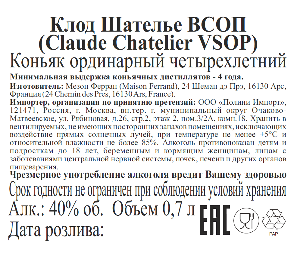 Аромат: Гармоничный аромат, из оттенков специй, спелых фруктов (абрикос, груша), цитрусовых (апельсин, цедра лимона), ванили и легких дубовых ноток. Вкус: Фруктово-пряный вкус с хорошей структурой, низкой спиртуозностью, легкостью для питья и приятными цитрусовыми мотивами. Коньяк идеален в качестве дижестива в чистом виде. Основным сырьем является виноград сорта Уни Блан, а также Коломбар, из которых традиционным способом изготавливается вино. Его медленно нагревают и дважды перегоняют в медных аламбиках. Только сердце дистиллята используется для дальнейшей выдержки, которая проходит в больших 350-литровых новых бочках из лимузенского дуба. Его древесина имеет большую пористость и высокий уровень танинности, что делает лимузенский дуб идеальным материалом для выдержки коньяка. Примерно через год спирты переливаются в более старые бочки, которые придают вкусу напитка гладкость, хороший баланс и богатый букет, в котором оттенки древесины уже не являются доминирующими. Благоприятные условия температуры и влажности являются ключевыми факторами для старения коньяка. Именно здесь происходят волшебные преобразования и взаимодействия между коньяком, древесиной бочки и окружающей средой, которые являются ключом к получению тонкого равновесия в выдержанных спиртах. Только искусному мастеру под силу создать совершенный купаж из различных по возрасту и происхождению спиртов, что в полной мере демонстрирует коньяк Claude Chatelier VSOP.