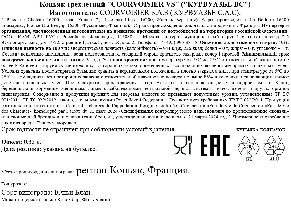 Французский коньяк Courvoisier VS с выдержкой в дубовых бочках не менее 3 лет - это прекрасный выбор для знакомства с линейкой бренда. В основе благородного напитка виноград, выращенный на знаменитых крю региона Коньяк - Фин Буа, Бон Буа и Пти Шампань. Аромат раскрывается фирменными для дома Courvoisier цветочными нотами, а также фруктовыми оттенками яблока, груши и грейпфрута. Частичная выдержка на осадке придает коньяку сложный и сбалансированный вкус с дубовыми акцентами в послевкусии.