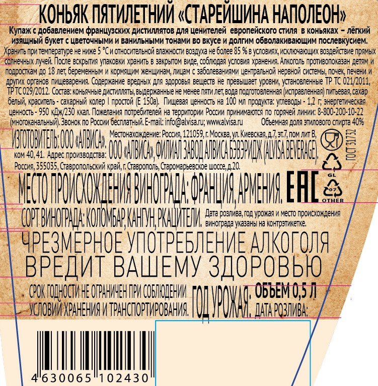 Коньяк Старейшина Napoleon 5 лет, 0.5л